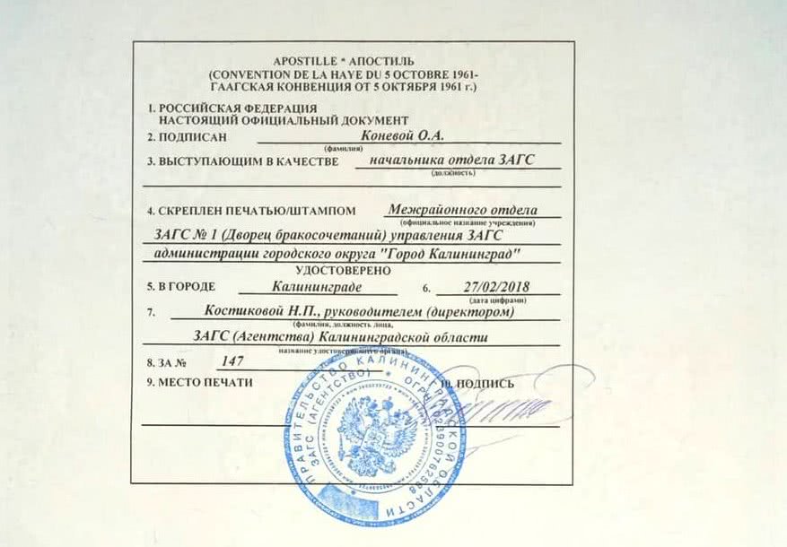 Если вы хотите использовать официальные документы, выданные органами ЗАГС, на территории другой страны, необходимо подтвердить их подлинность в Комитете по делам записи актов гражданского состояния. Для этого нужно проставить на документе специальный оттиск штампа (апостиль), форма которого определена Гаагской конференцией.