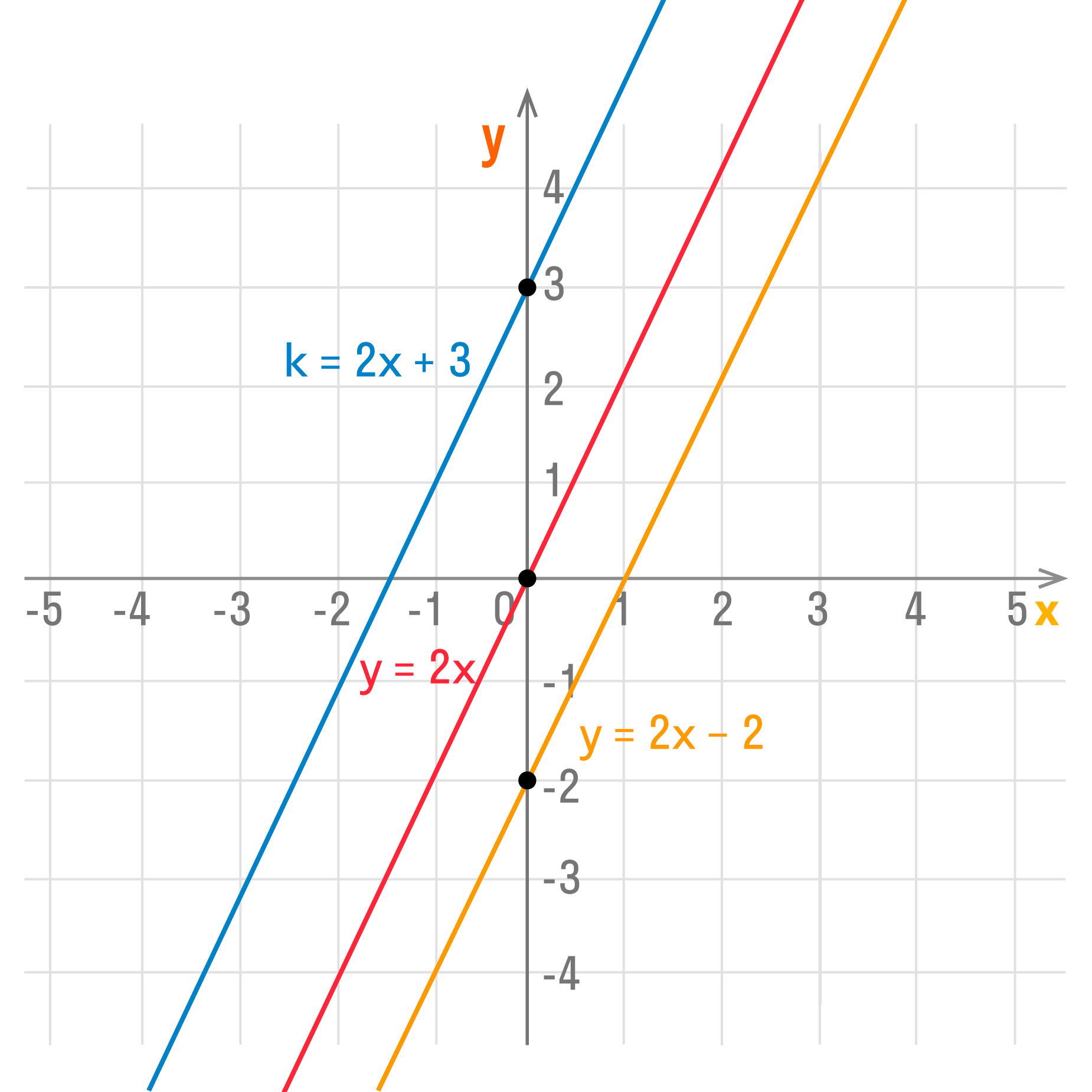 Рассмотрим графики функций y = 2x + 3, y = 2x, y = 2x — 2.