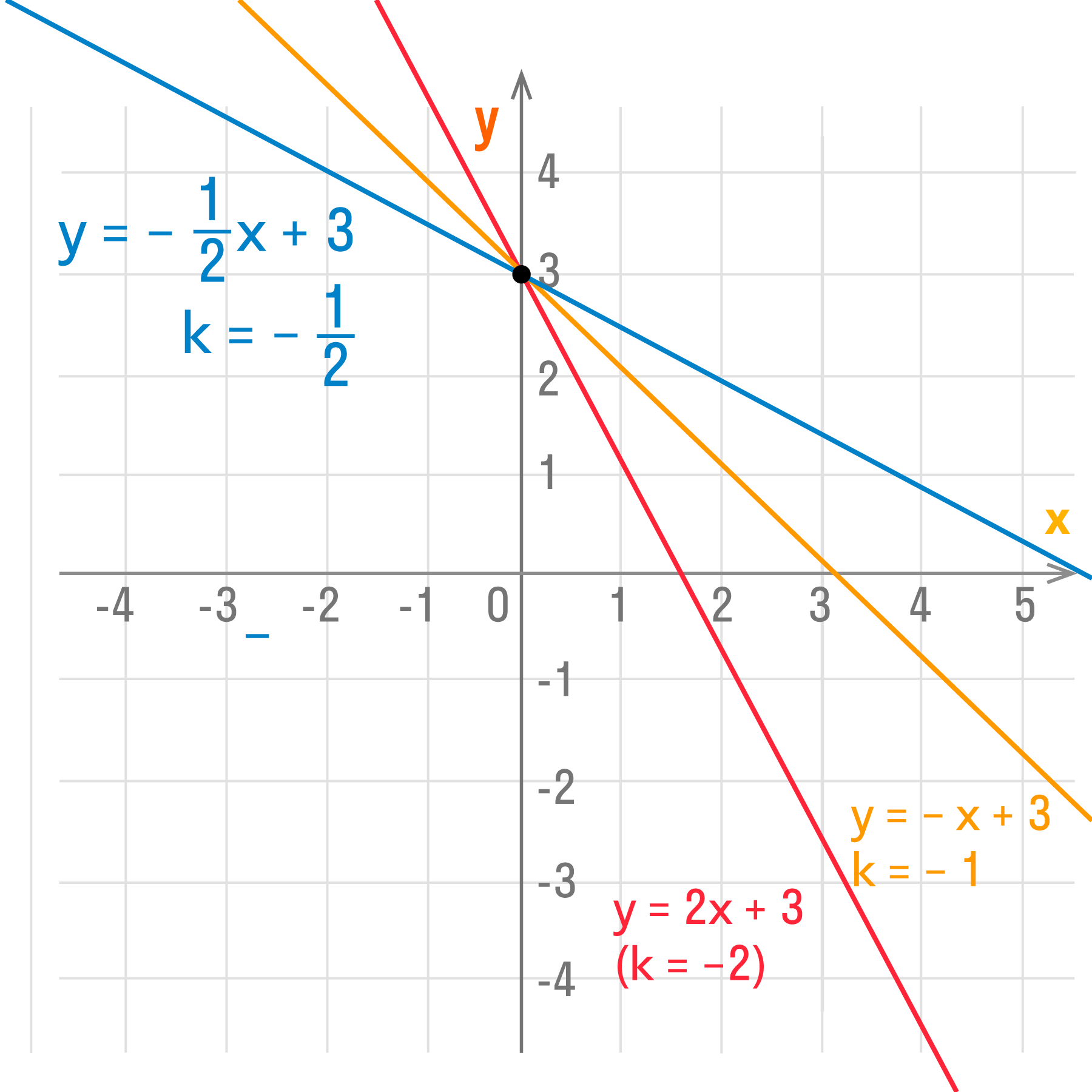 В каждой функции b = 3, поэтому все графики пересекают ось OY в точке (0; 3).