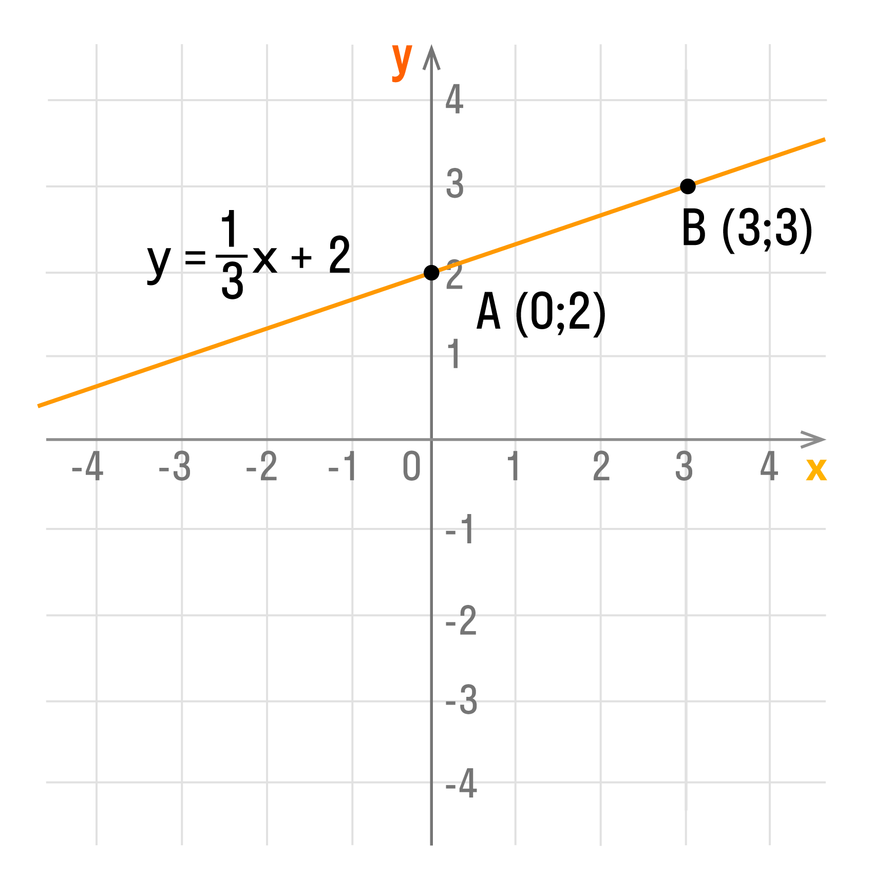 Например, чтобы построить график функции y = 1/3x + 2, можно взять х = 0 и х = 3, тогда ординаты этих точек будут равны у = 2 и у = 3. Получим точки А (0; 2) и В (3; 3). Соединим их и получим такой график: