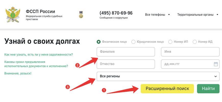 Чтобы проверить сведения в банке данных исполнительных производств, выберите поиск физических лиц. Введите территориальный орган, фамилию, имя, отчество и дату рождения. После подтверждения данных на экране появится информация обо всех долгах физического лица.