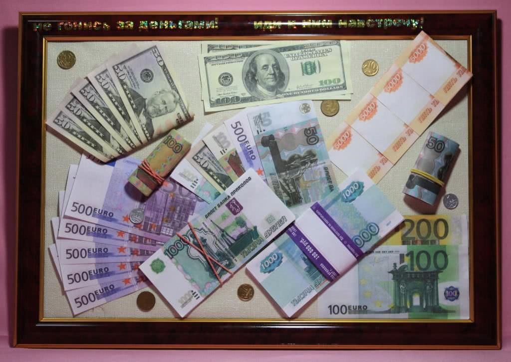 Красиво подарить деньги можно в виде панно в рамке. Есть 2 оригинальных идеи такого подарка: