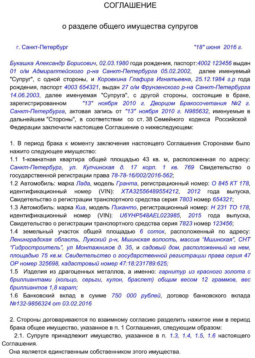 2.2. Супругу принадлежит имущество, указанное в п. 1.2. и 1.3. настоящего Соглашения. Он является единственным собственником указанного имущества.
