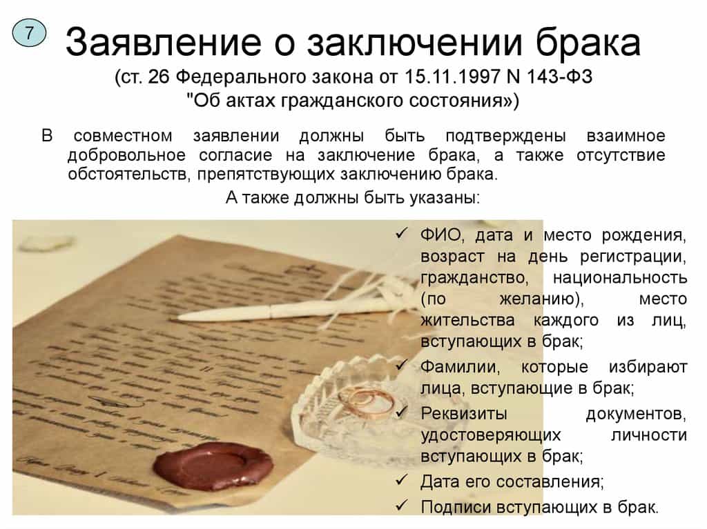 - лица, подавшие заявление, должны достичь брачного возраста. В России брак заключается только с 18 лет. При наличии особенных обстоятельств возраст вступления в брачную связь может быть снижен до 16 лет и даже до достижения этого возраста. Данное положение распространяется на мужчин и женщин.