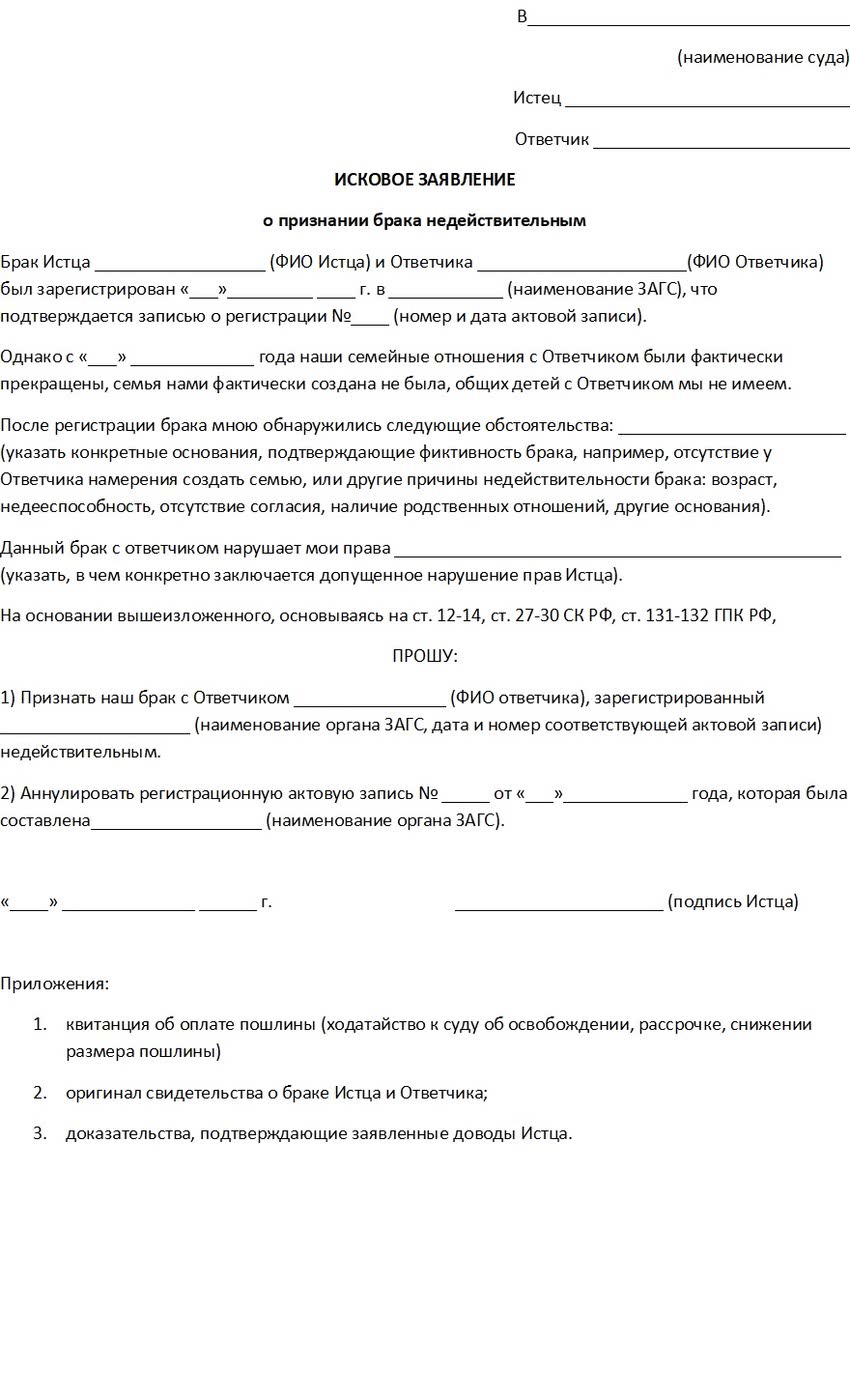 - просительная часть (требования: о признании недействительности, об аннулирование записи о браке, о возмещении вреда и т.д.);