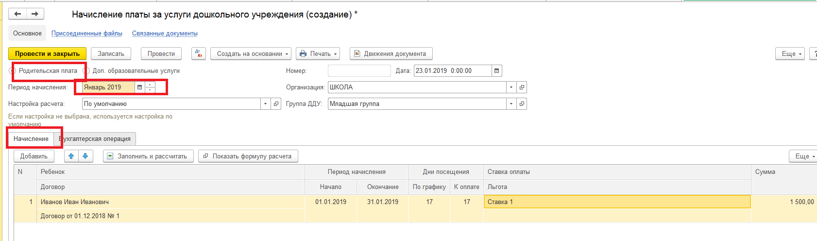 После того как в программе создан документ «Табель учета посещаемости детей», необходимо создать документ начисление платы за услуги дошкольного учреждения, который также находится в блоке «Родительская плата». При вводе нового документа нужно выбрать вариант расчета: «Родительская плата» или «Дополнительные образовательные услуги».
