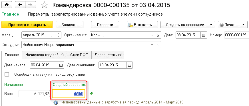 С 6 по 10 апреля 2015 года организация направляет работника в командировку. Необходимо рассчитать средний заработок сотруднику.