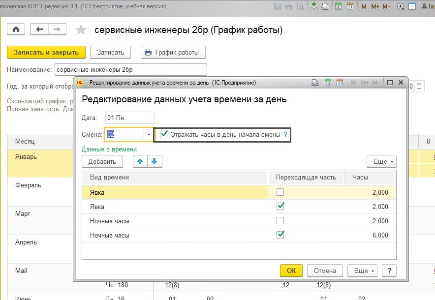При суммированном подсчете времени наиболее распространенный режим — это работа сменами. Внедряется в компаниях с круглосуточной работой, а также в тех, где продолжительность дневной работы превышает 8 часов в день.