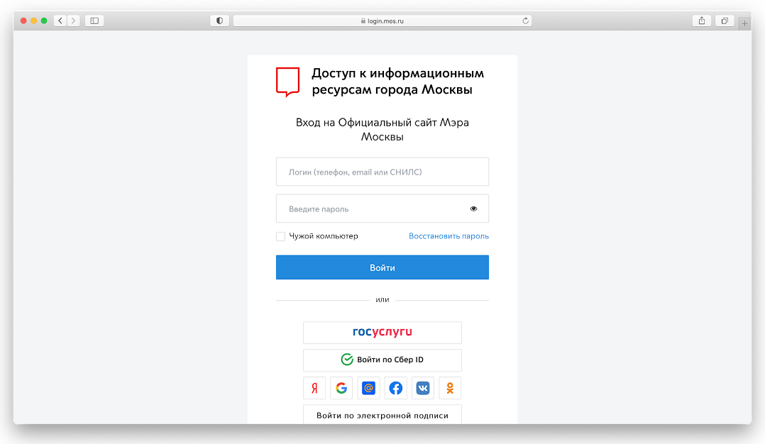Окно регистрации на mos.ru