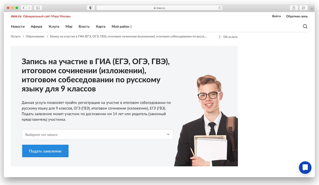 В разделе «Услуги» найдите подраздел «Образование». Нужная услуга называется: «Запись на участие в ГИА (ЕГЭ, ОГЭ, ГВЭ), итоговом сочинении (изложении), итоговом собеседовании по русскому языку для 9 классов». Её легко найти в поиске.