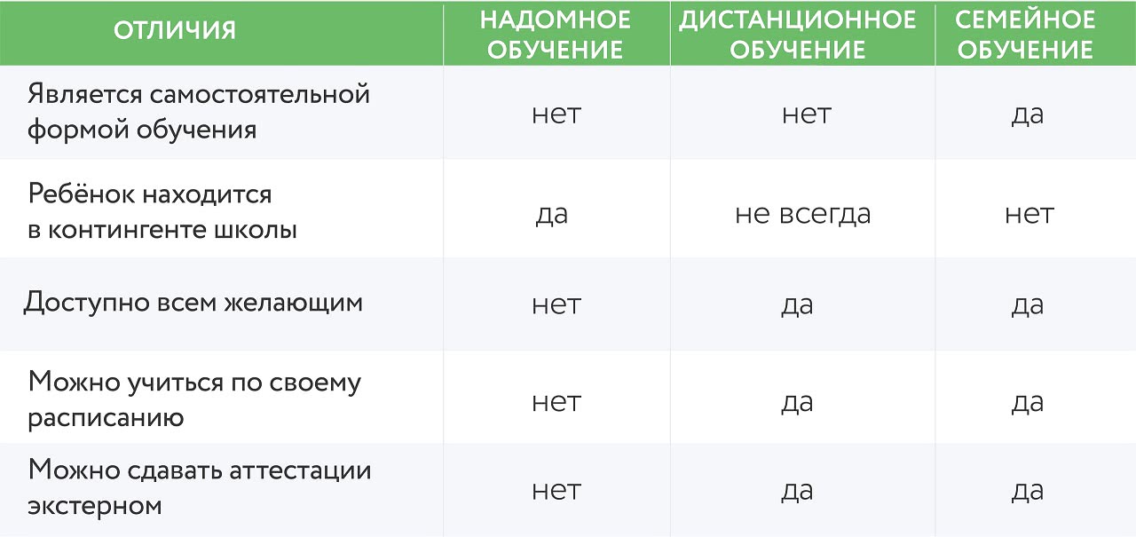 В отличие от надомной формы, семейная не предусматривает бесплатных визитов педагогов на дом и согласования с методистами учебной программы. Она оставляется на усмотрение родителей.