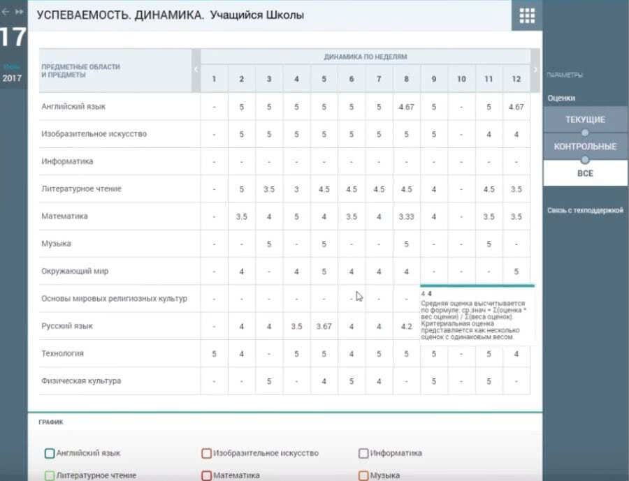 - Для просмотра динамики изменений средневзвешенного балла за неделю по каждому уроку, кликните пункт меню «Анализ». Затем выберите раздел «Динамика успеваемости». При наведении стрелки мыши на показатель среднего балла вы увидите, как и по каким данным его рассчитали. С помощью фильтра установите, производить отметку по всем выставленным оценкам, либо только за контрольные задания.