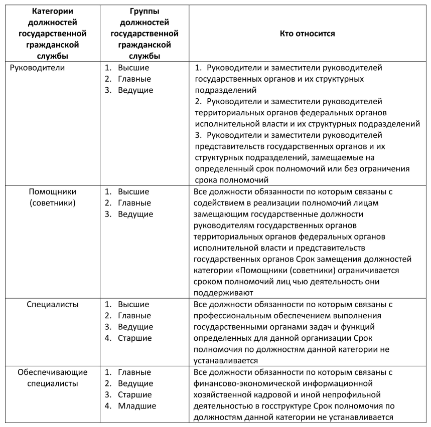 - категории: руководители, помощники (советники) специалисты, обеспечивающие специалисты;