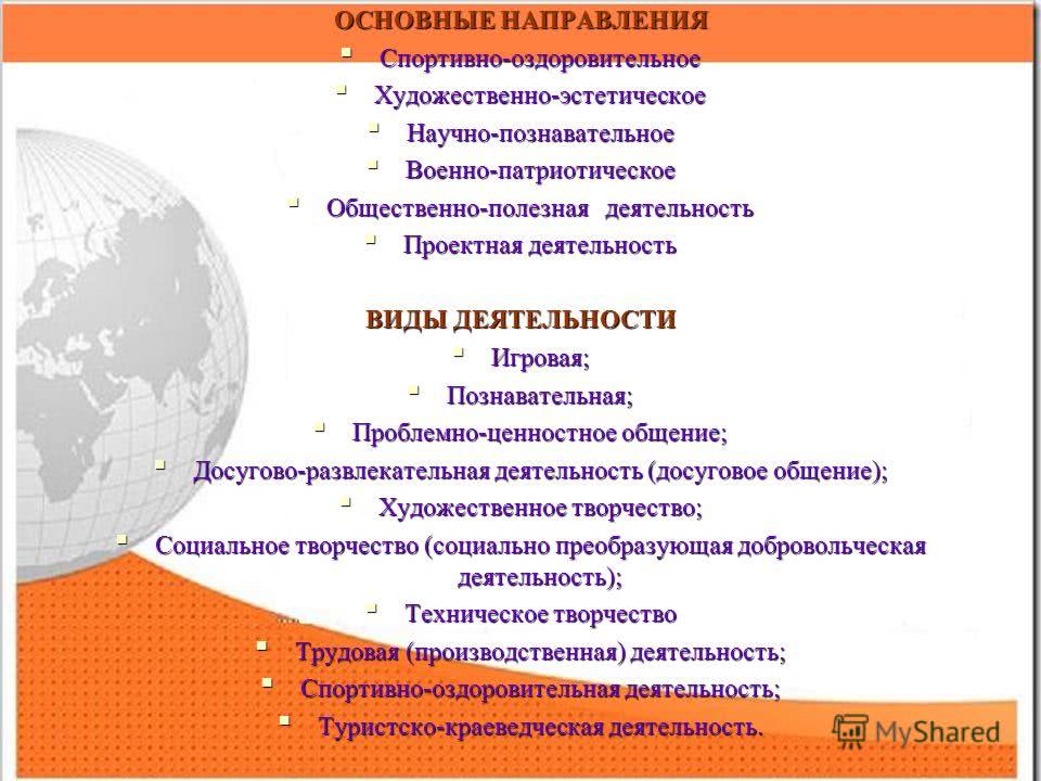 ОСНОВНЫЕ НАПРАВЛЕНИЯ Спортивно-оздоровительное Спортивно-оздоровительное Художественно-эстетическое Художественно-эстетическое Научно-познавательное Научно-познавательное Военно-патриотическое Военно-патриотическое Общественно-полезная деятельность Общественно-полезная деятельность Проектная деятельность Проектная деятельность ВИДЫ ДЕЯТЕЛЬНОСТИ Игровая; Игровая; Познавательная; Познавательная; Проблемно-ценностное общение; Проблемно-ценностное общение; Досугово-развлекательная деятельность (досуговое общение); Досугово-развлекательная деятельность (досуговое общение); Художественное творчество; Художественное творчество; Социальное творчество (социально преобразующая добровольческая деятельность); Социальное творчество (социально преобразующая добровольческая деятельность); Техническое творчество Техническое творчество Трудовая (производственная) деятельность; Трудовая (производственная) деятельность; Спортивно-оздоровительная деятельность; Спортивно-оздоровительная деятельность; Туристско-краеведческая деятельность. Туристско-краеведческая деятельность.