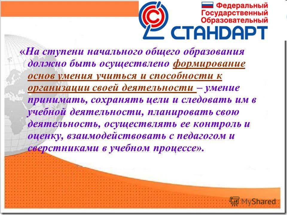 «На ступени начального общего образования должно быть осуществлено формирование основ умения учиться и способности к организации своей деятельности – умение принимать, сохранять цели и следовать им в учебной деятельности, планировать свою деятельность, осуществлять ее контроль и оценку, взаимодействовать с педагогом и сверстниками в учебном процессе».