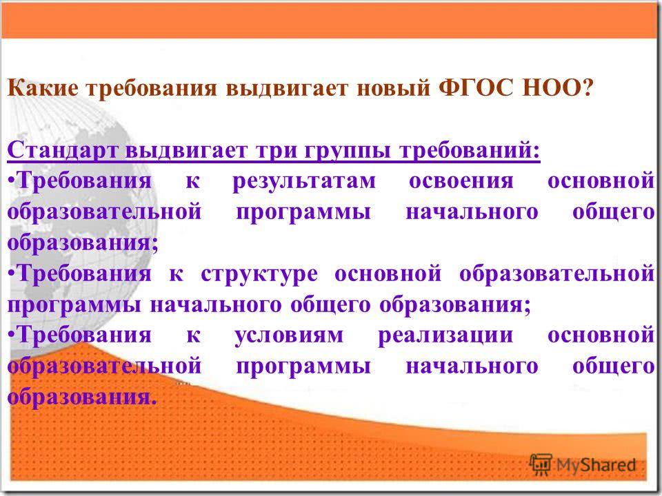 Какие требования выдвигает новый ФГОС НОО? Стандарт выдвигает три группы требований: Требования к результатам освоения основной образовательной программы начального общего образования; Требования к структуре основной образовательной программы начального общего образования; Требования к условиям реализации основной образовательной программы начального общего образования.