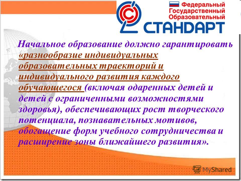 Начальное образование должно гарантировать «разнообразие индивидуальных образовательных траекторий и индивидуального развития каждого обучающегося (включая одаренных детей и детей с ограниченными возможностями здоровья), обеспечивающих рост творческого потенциала, познавательных мотивов, обогащение форм учебного сотрудничества и расширение зоны ближайшего развития».