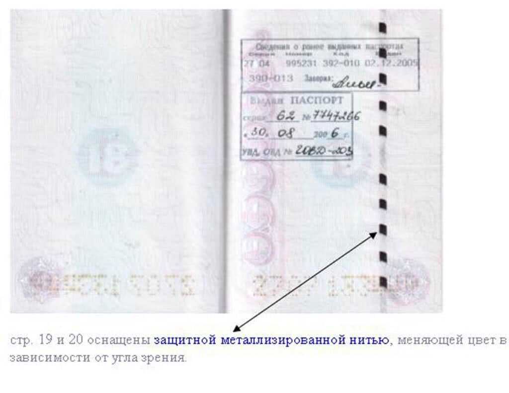 - вдоль 19 и 20 страниц проходит металлизированная нить. Этот способ дополнительной защиты от подделок. В паспортах старого формата ее нет. Нити стали использовать при изготовлении документов с 2006 года.