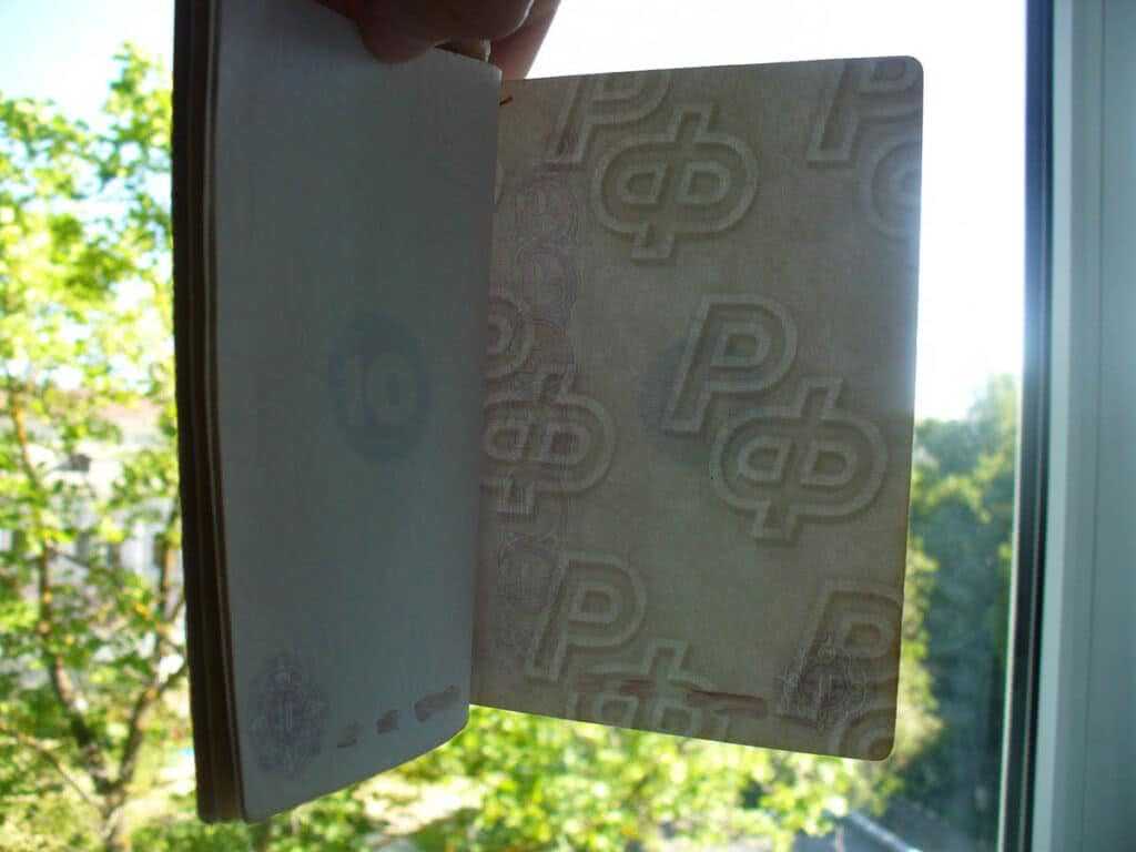 - каждая внутренняя страница имеет водяной знак. Выглядеть он должен как объемные буквы «РФ». Их хорошо видно, если приблизить страницы к источнику света;
