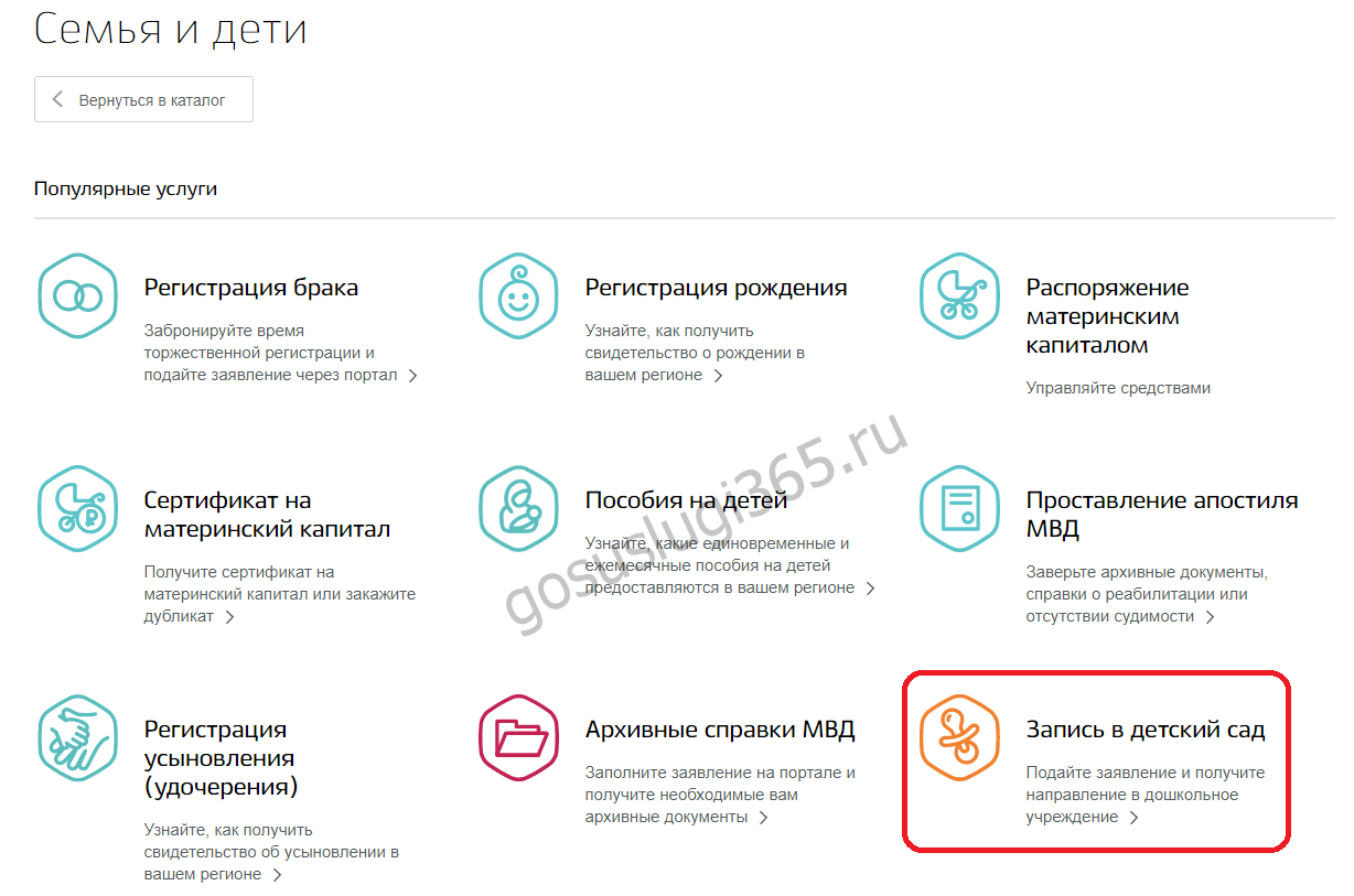 Далее выбираем значок с нужной темой, он в нижнем ряду. В нашем случае «Запись в детский сад».